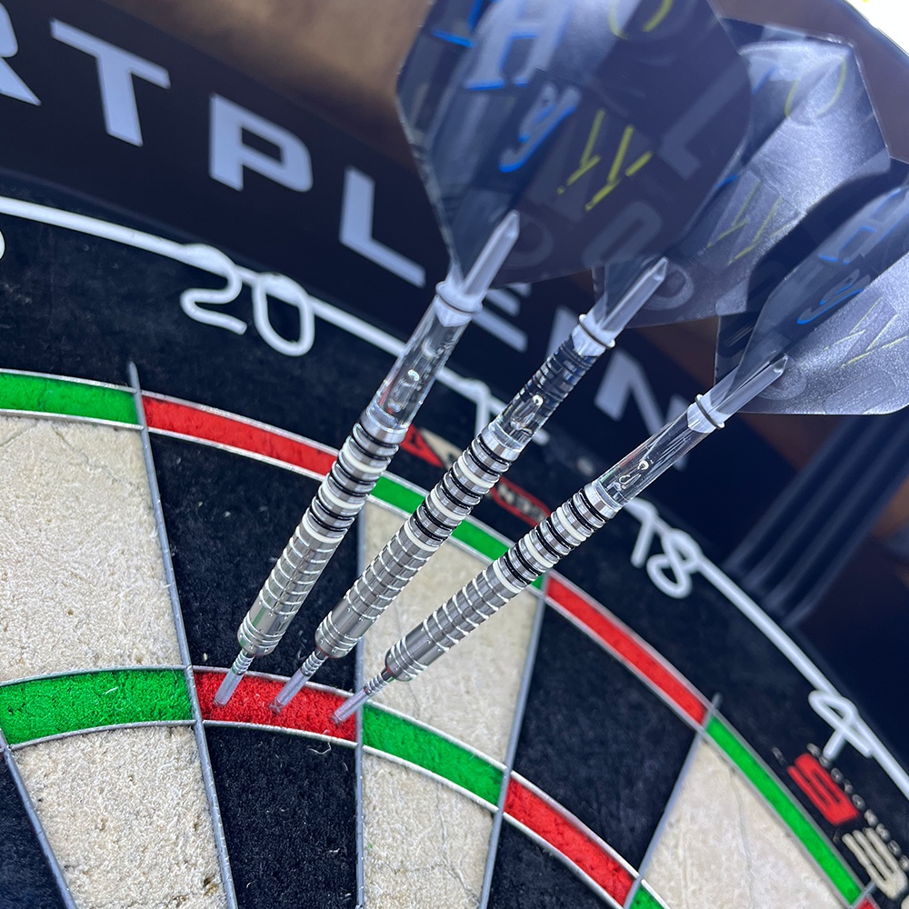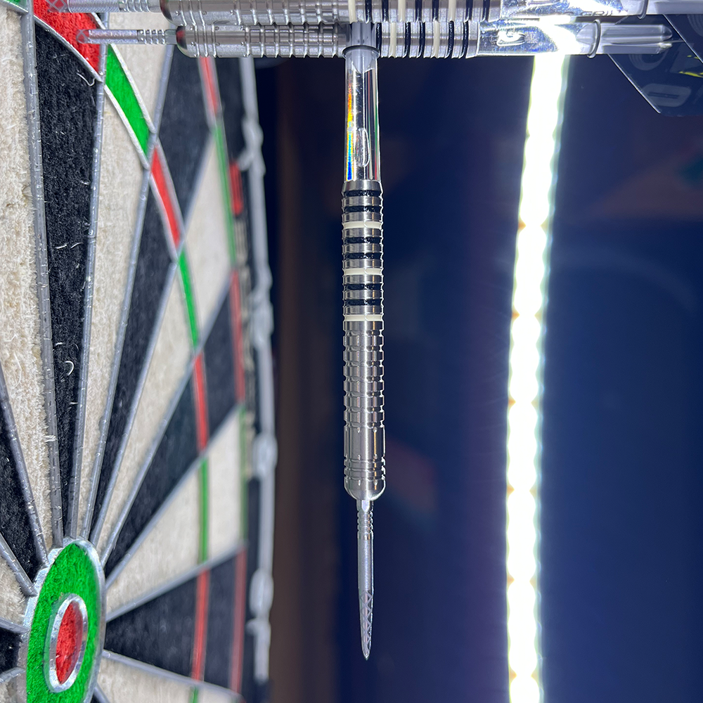 De matte afwerking zorgt voor extra comfort en stabiliteit, terwijl de kleuren subtiel verwijzen naar Dobey’s roots in Newcastle. Dankzij de hoogwaardige 90% tungsten barrel en strakke afwerking ogen ze professioneel én presteren ze solide.